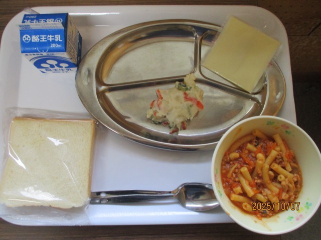 本日は、小型食パン、スライスチーズ、ポテトサラダ、マカロニのミートソース煮でした。