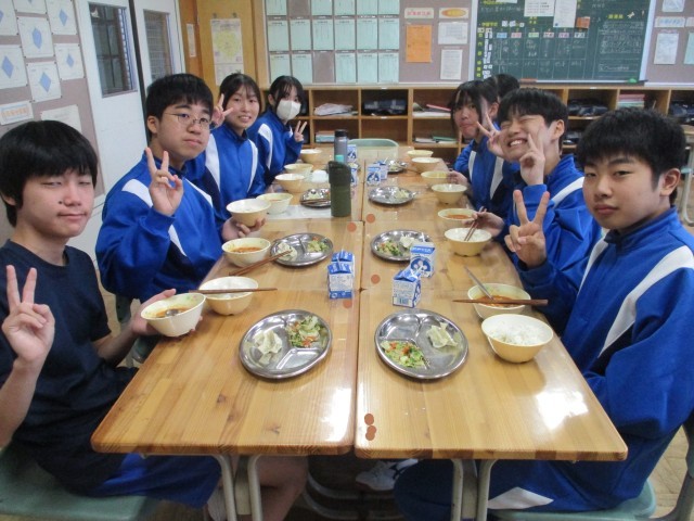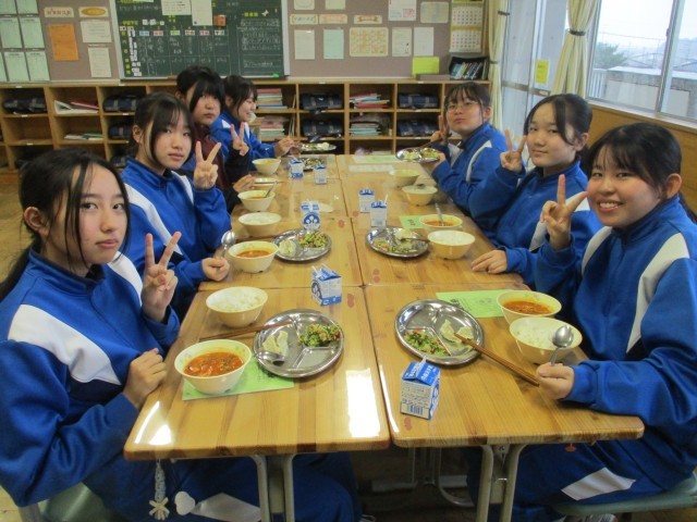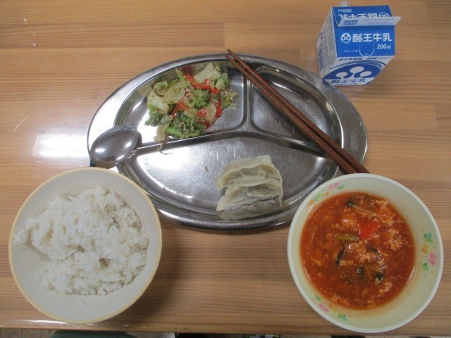 メニューは、麦ごはん、ひじき入り餃子、ブロッコリーのかに風味サラダ、鶏肉と卵のチリソース煮でした。