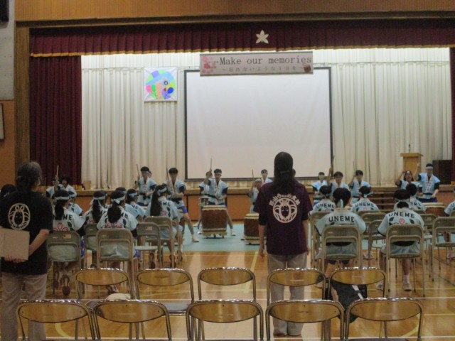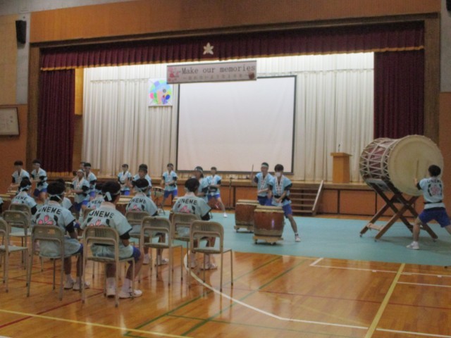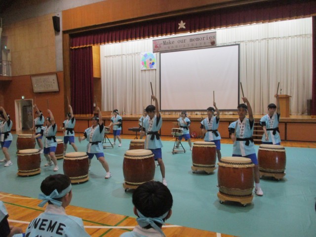本日、うねめ太鼓練習最終のリハーサルが行われました。明日の文化祭に向け、法被を着て、他学年に成果を披露しました。最後にうねめ太鼓保存会の指導者の方々から指導をいただき、本番に向けてアドバイスをいただきました。