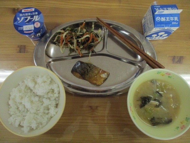 本日は「郡山第四中学校の立案献立」の日です。メニューは、麦ごはん、さばの味噌煮、海藻サラダ、油揚げの味噌汁、ヨーグルトでした。