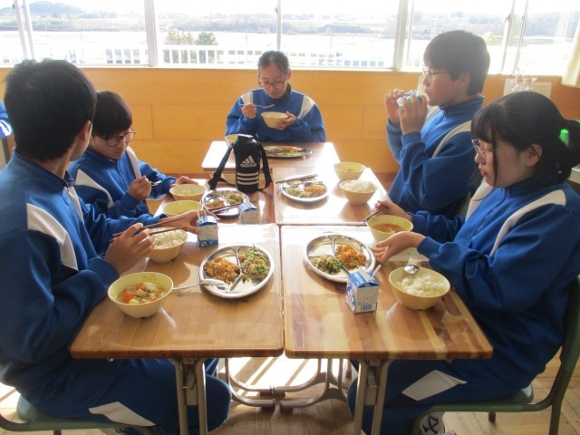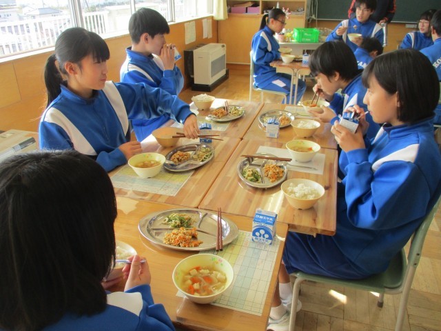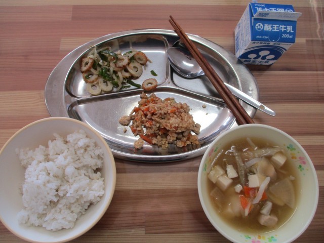 今日は、「鳥取市郷土料理献立」の日です。メニューは、麦ごはん、ラッキョウのピリ辛そぼろ、ちくわとピーマンの和え物、いもこん鍋でした。