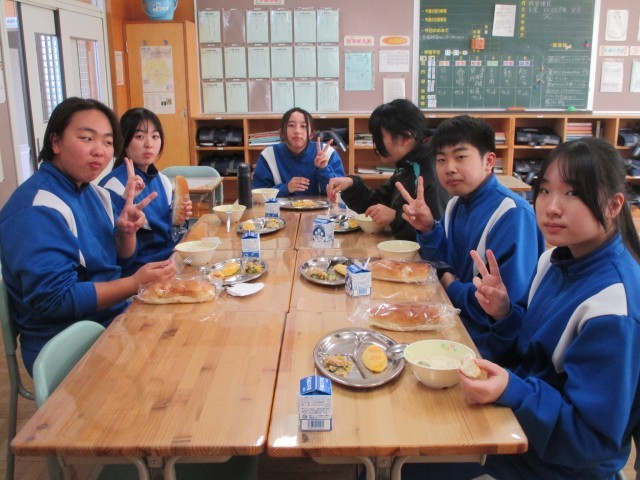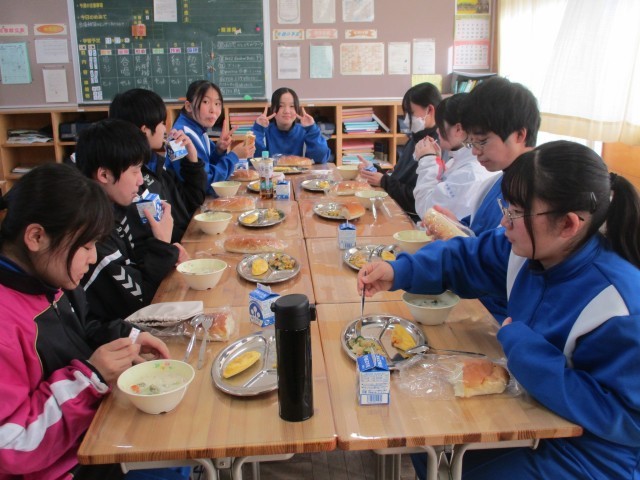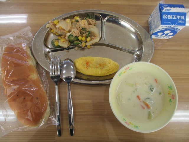 本日は、「ふくしま健康応援メニュー」の日です。メニューは、チーズパン、ミートオムレツ、かぶとツナのサラダ、鶏肉とブロッコリーのクリームシチューでした。