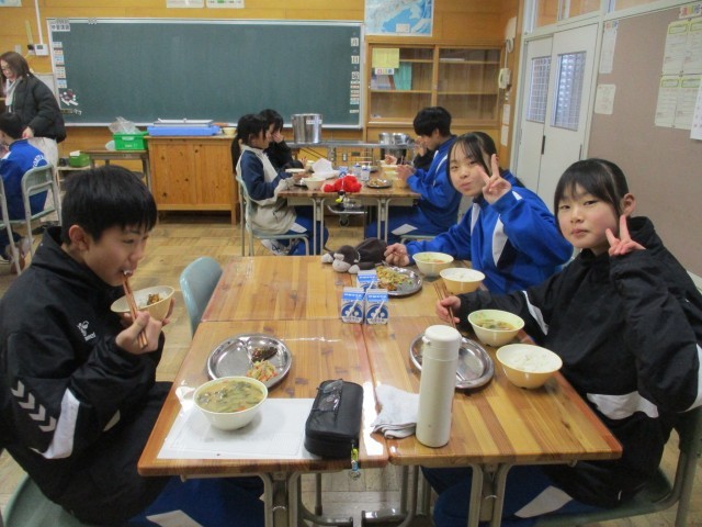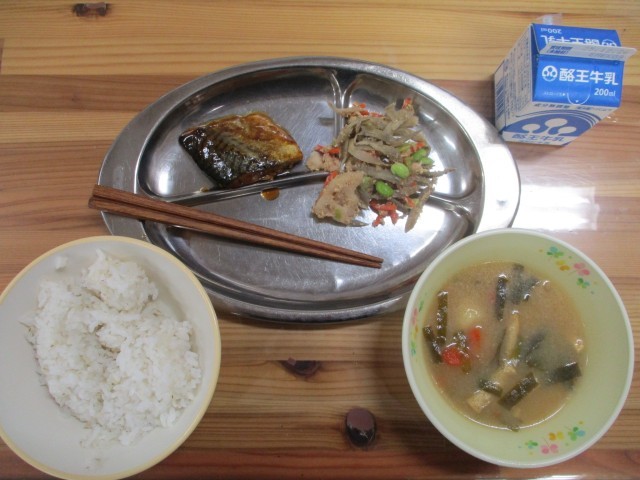 「冬野菜献立」の日です。メニューは、麦ごはん、さばのカレー煮、れんこんのごま和え、いも団子汁でした。