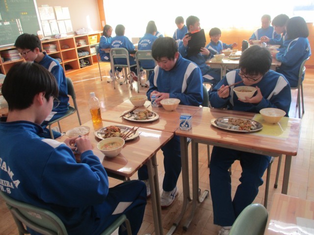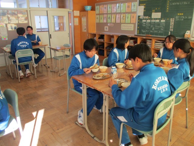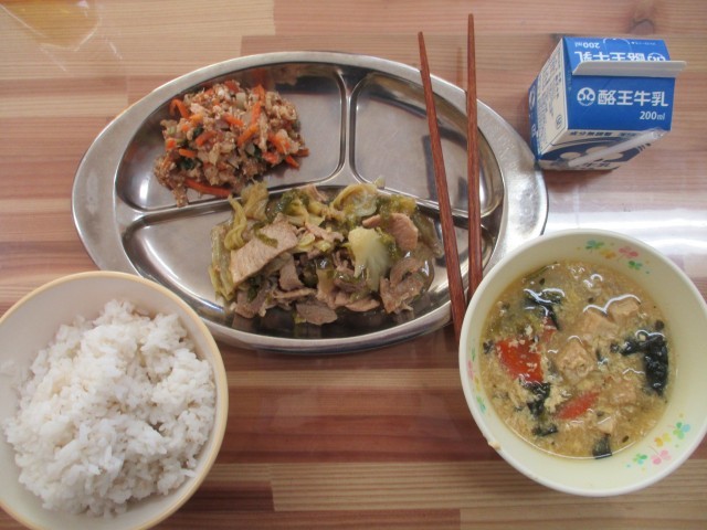 本日のメニューは、麦ごはん、豚肉とキャベツの炒め物、大根のおかか和え、かき玉汁でした。