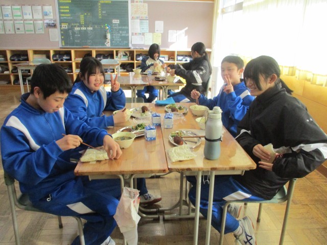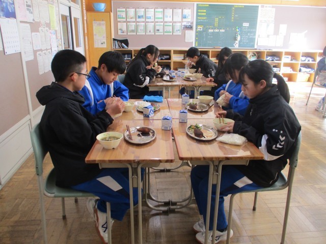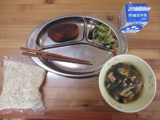 3学期の始めの給食は、「旬の味覚献立~白菜~」でした。メニューは、きつねうどん、ミニココア揚げパン、白菜の青じそ風味和えでした。