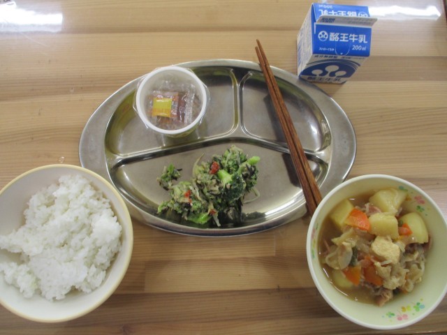 本日のメニューは、あさか舞ごはん、納豆、ひじきと野菜の和え物、じゃがいもと豚肉の煮物でした。