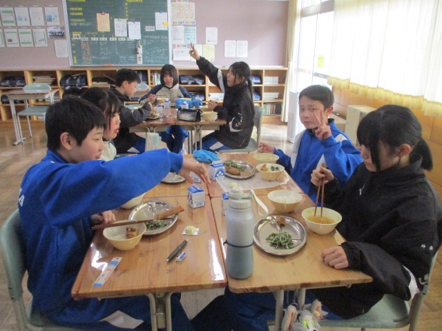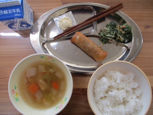 1月14日は、大槻中学校の立案献立の日でした。メニューは、麦ごはん、春巻き、ツナあえ、シーフードスープ、型抜きチーズでした。