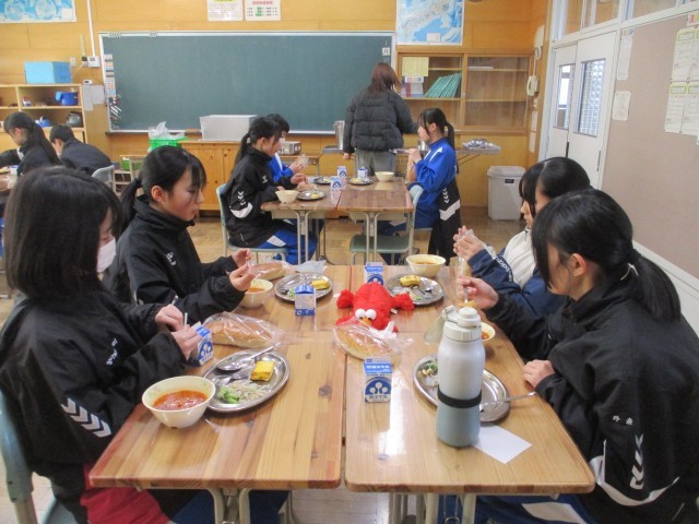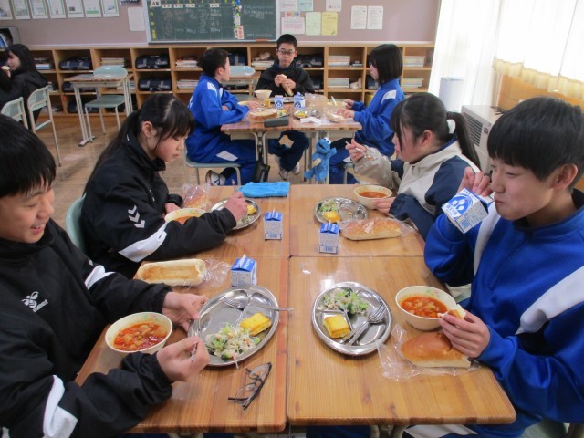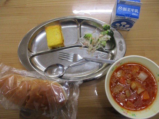 1月20日のメニューは、アップルパン、キッシュ風オムレツ、ブロッコリーとかにかまのサラダ、トマトスープでした。