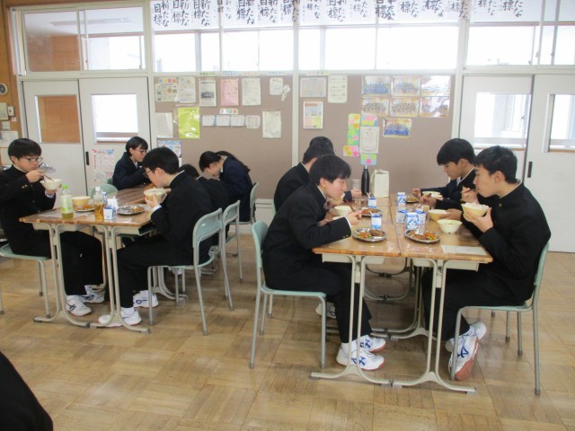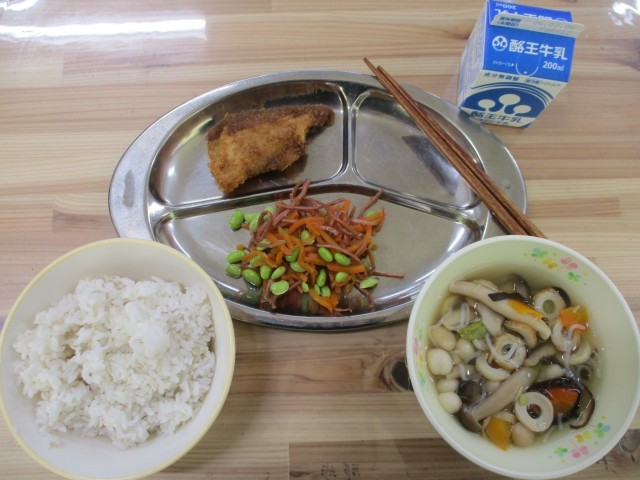 「学校給食記念日献立」の日です。メニューは、麦ごはん、県産かじきカツ、いか人参、こづゆでした。