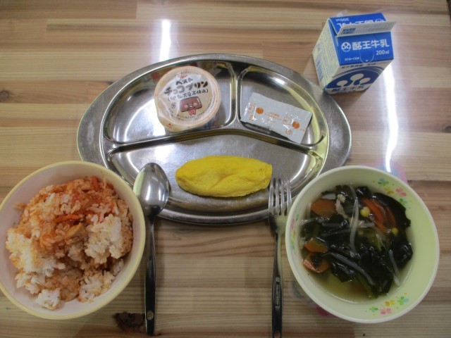 本日は「バレンタイン献立」の日です。メニューは、チキンライス、オムレツ、コンソメスープ、パックケチャップ、チョコプリンでした。