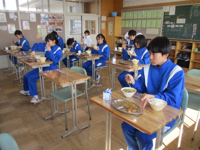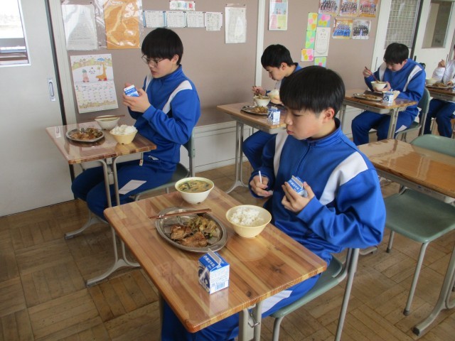 2月13日のメニューは、麦ごはん、鶏肉のにんにく醤油焼き、五目きんぴら、にら玉味噌汁でした。