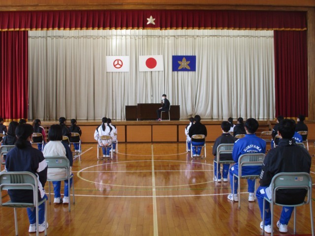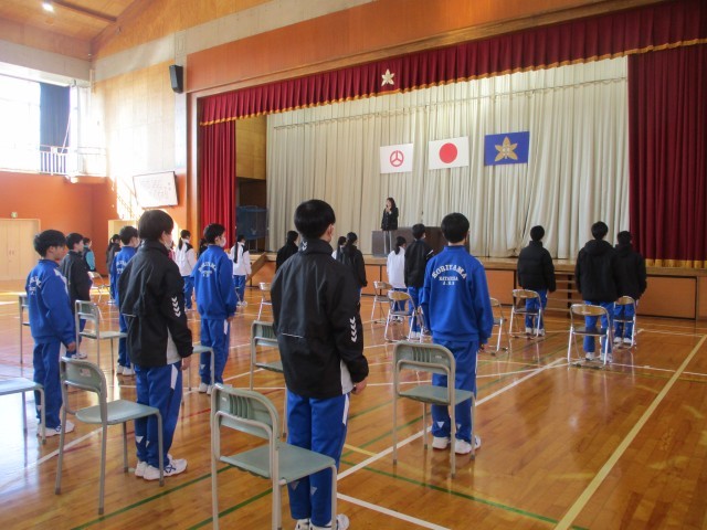 卒業式全体練習1回目がありました。生徒指導担当より、礼法指導があり、その後、音楽担当より校歌の指導がありました。一人一人が緊張感をもって集中して取り組んでいました。