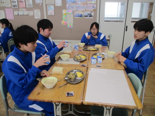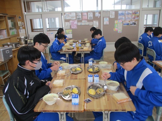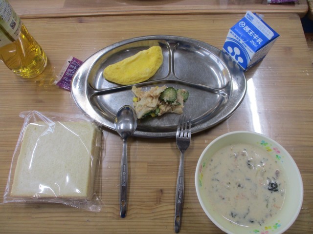本日は、「ふくしま健康応援メニュー」の日です。メニューは、食パン、ブルーベリージャム、チーズオムレツ、かぶとツナのサラダ、トマトとほうれん草のクラムチャウダーでした。