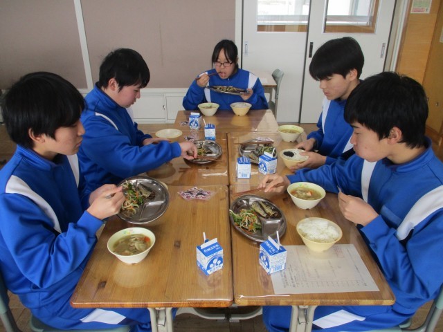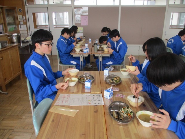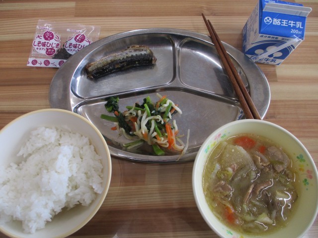 今日のメニューは、あさか舞ごはん、ひじきの佃煮、いわしのしょうが煮、小松菜の和え物、豚汁でした。
