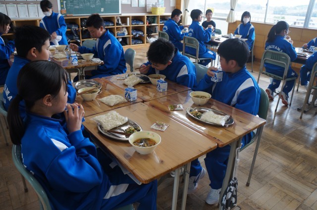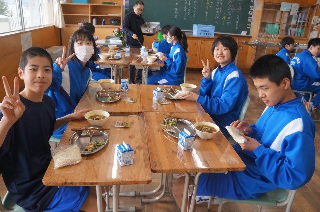 今日のメニューは、きつねうどん・茎立ち菜のぶしマヨ和え・ビーンズカルでした。1年生にとっては今日が中学校の給食デビューでした。お味はいかがでしたか?1年生の給食の様子も載せてみました。