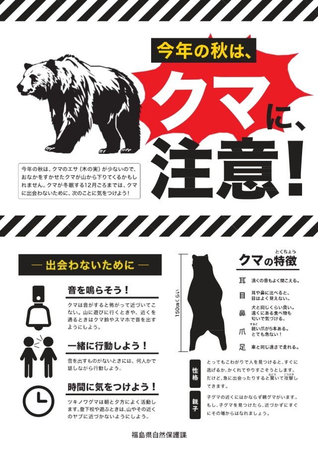 今年度は、ツキノワグマの目撃件数が過去最多ペースで推移しており、秋以降もクマの餌の状況等から出没が増加することが見込まれるようです。