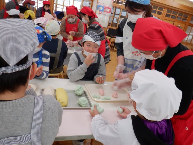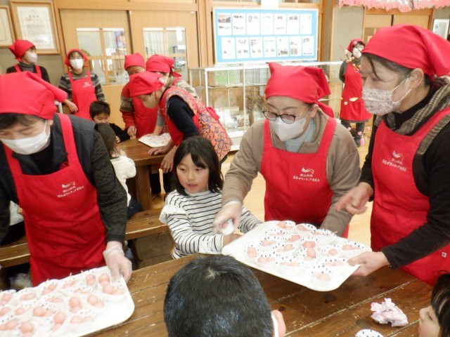 湖南地区のボランティアの方々をお招きして、1,2年生が伝統行事の団子さしを体験しました。まずは、団子さしの成り立ちについてお話を聞いた後、ボランティアの方々と一緒に団子作りと飾り付けです。とってもすてきな団子さしが出来上がりました!