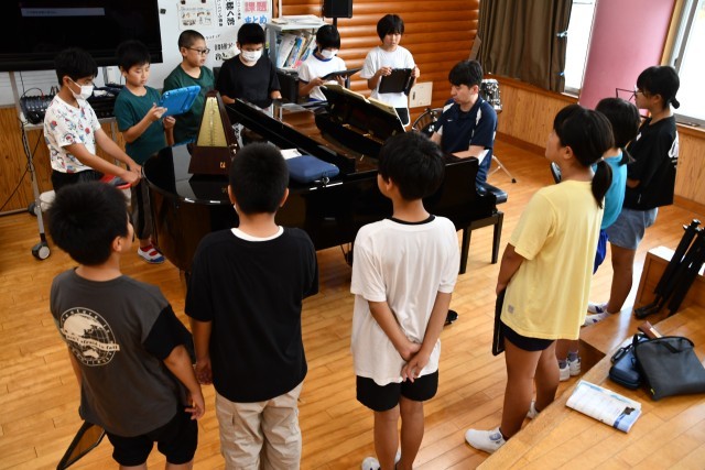 ピアノの周りにみんなで集まって合唱練習をしていました。