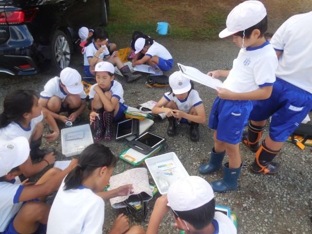 お天気のもとで,講師の先生の説明をよく聞き取りながら,パックテスト等の水質調査に取り組みました。白鳥浜や上戸浜,湖南港と調査が進むごとに,子どもたち自身が調査のしかたを理解し,意欲的に活動することができました。