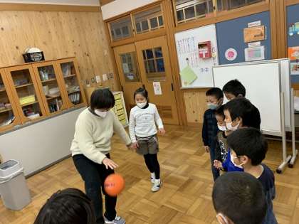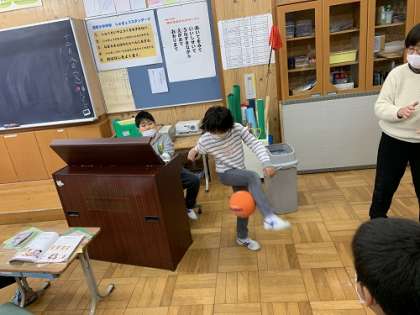 今日の音楽の授業では、わらべ歌の「あんたがたどこさ」を担任と一緒に歌ってみました。歌いながらボールを弾ませるのに悪戦苦闘していました。