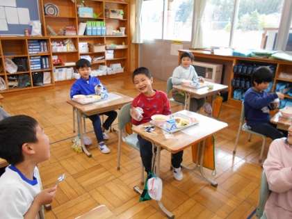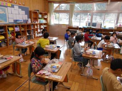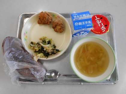 今日は1.2年、つばさ学級のリクエスト給食でした。メニューはココア揚げパン、牛乳、野菜スープ、ツナサラダ、からあげ、りんごゼリーでした。
