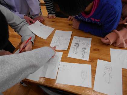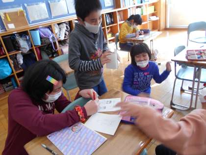 今日は、5時間目に少しあまった時間を使って「絵の描き方講座」が行われました。「目は?」「輪郭は?」「体は?」とたくさんの質問が出ました。その一つ一つの描き方を丁寧に教えてもらいみんなで人間を描きました。描いた後は、教えてくれた子に採点もしてもらいました。バランスをとったり、本物のように描いたりするのはまだまだ難しいようですが、一生懸命描いた絵をほめてもらえるととてもうれしそうでした。