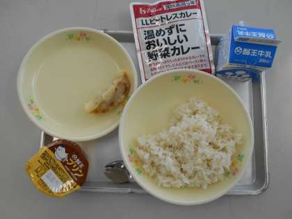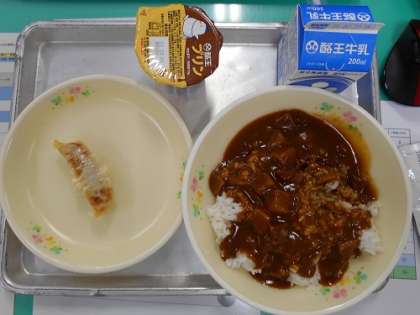 今日はカレー、ごはん、餃子、プリン、牛乳でした。
