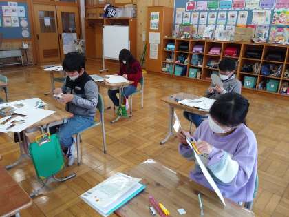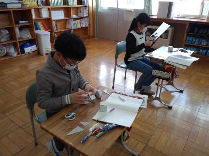 算数の学習で、立方体はどんな展開図になるのかを考えました。面の形や数、辺の長さに着目して立方体の展開図を描き、本当に立方体になるのか組み立てて確認しました。子ども達は、展開図を描いたり、立体を組み立てたりする活動を、楽しみながら行っていました。