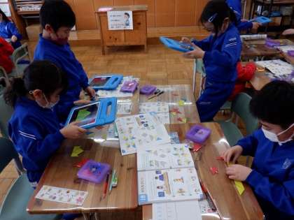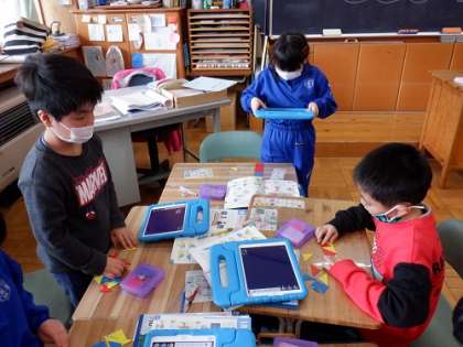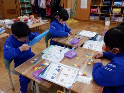 三角の色板を使って、魚やロケット、お家などの形を作りました。色板を組み合わせると、四角ができたり、大きな三角や四角になることに気付きました。今日は、自分で作ったかたちを写真に撮りました。明日は、写真を見せながら、そのかたちを発表します。