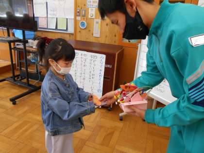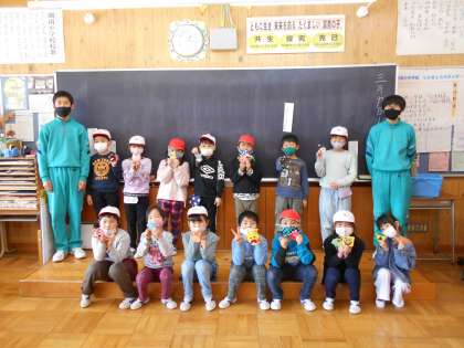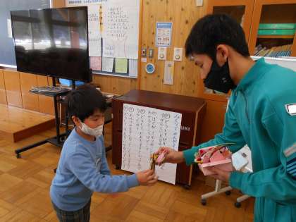9年生は、家庭科の授業でワッペンづくりをしていました。昨日、無事に完成したようです。今日、代表生徒2人が1年生教室へ届けに行きました。「うわぁ〜!すごい!」「ありがとうございます!」と目を輝かせる1年生に、2人とも目を細めていました。