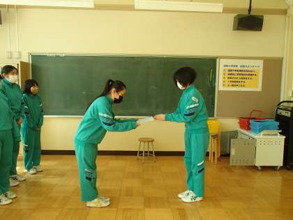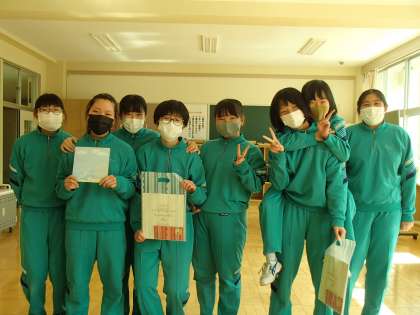 10日昼休みに、バレーボール部のお別れ会を笑顔あふれる雰囲気の中行いました。代表の現部長から感謝の言葉を述べた後、一人ひとり感謝の気持ちを書いた色紙を手渡しました。9年生からも後輩へ今までの励ましと今後の活躍を期待する言葉をいただきました。会終了後、もらった色紙を後輩の前で楽しそうに読む姿が見られました。