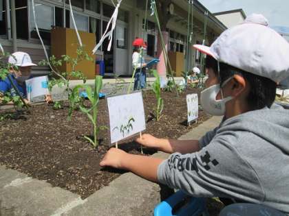 この前植えた野菜に、名前をつけて、看板を立てました。すると、「大きくなった気がします」「つるが伸びました」という声が。タブレットで写真を撮って、葉っぱの数や茎の高さなどを調べて写真に書き込んでいました。これからも、成長の様子を記録していきたいと思います。