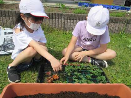 大きなプランターに、マリーゴールドを植えかえました。今まで狭い部屋にいたので、根っこが窮屈そうでしたが、大きな部屋に移動したので、きっとのびのびと大きくなれるでしょう。これから、きれいな花が咲くのが楽しみです。
