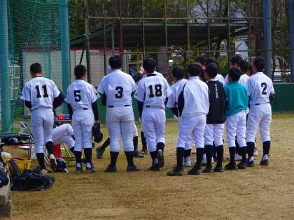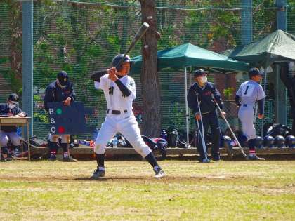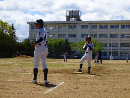 一塁で笑顔をのぞかせ、ベンチを見る生徒。ベンチに戻ると次の回に向けて、監督の話を真剣に聞く生徒の姿が微笑ましく感じられました。