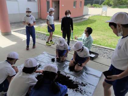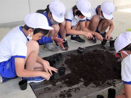 4年生はヘチマの種を植えました。まずは苗ポットに培養土を入れるところから始まりました。これからヘチマが大きく育つまで、楽しみながら観察してくださいね。