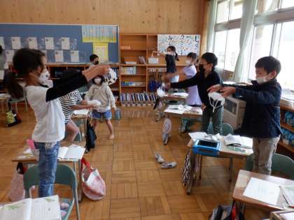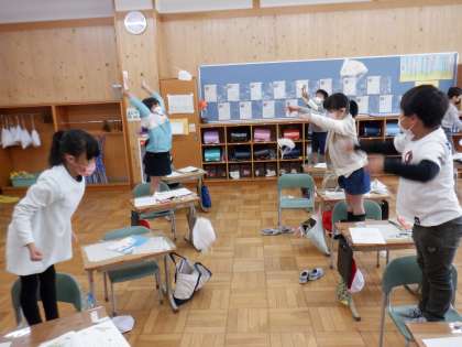 国語で「たんぽぽのちえ」の学習をしています。わた毛の1つ1つは、ひろがると、ちょうど らっかさんのようになることを学んだ2年生。ティッシュを使い、実際に落下傘を作ってみました。明日は、たおれていた花のじくが、せのびをするようにぐんぐんのびていくのかのなぞについて考えていきます。