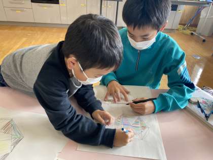 本日、4校時に7年生で数学の平面図形の単元で正六角形に合同な図形を敷き詰める授業を行いました。模様を作った後、1年生と一緒にパッチワークのデザインを考え、図形を色塗りを行いました。7年生が1年生と一緒に活動する姿は新鮮で湖南小中ならでは活動となりました。