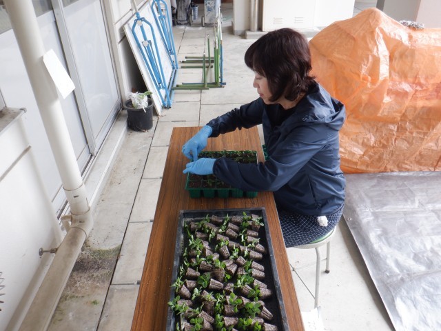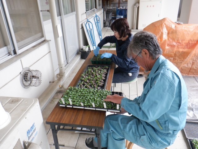 三世代交流に向け、用務員さんとSSSさんがパンジーの苗を植えかえしてくださいました。