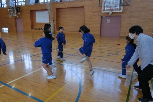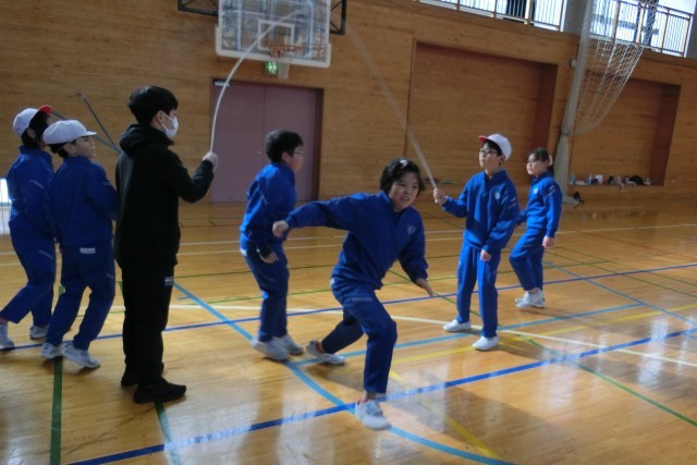 5年生が2年生の回数を数えたり、お互いの学年で持久跳びを行ったりと、楽しく行うことができました。