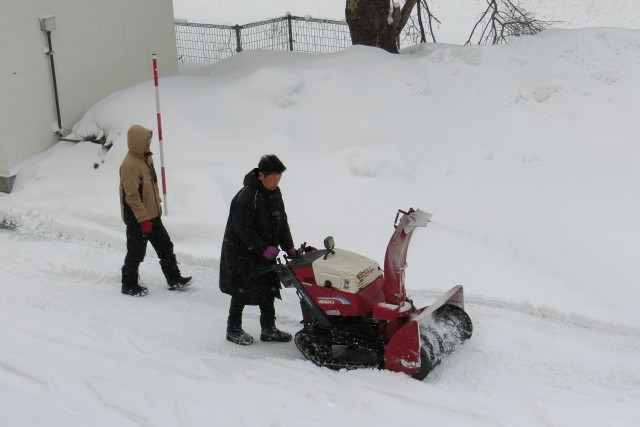 教頭先生と用務員さんが協力しながら除雪機を使った除雪です。 -