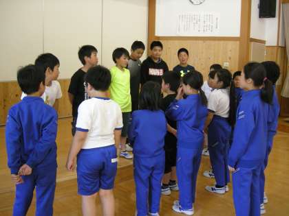 6年生が大会などに参加することが多くなるため、5年生からエールを送ることになります。これまで6年生がやってくれていたことを5年生がやるということで、はりきっていた5年生。6年生は先輩らしく、ポイントを抑えながら指導してくれました。