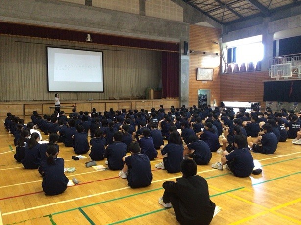 今日の2校時目、1年生は体育館で学年道徳を行いました。