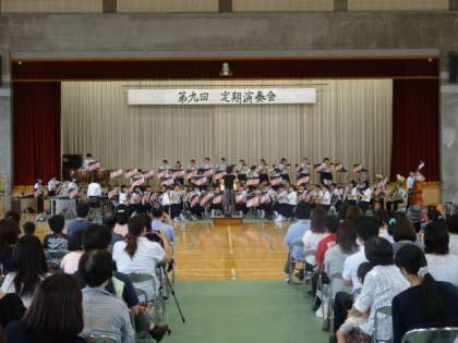 5日(土)13:00〜、本校体育館に於いて、吹奏楽部による『第9回定期演奏会』が開催されました。演奏会は3部のプログラムで構成された曲目(下記参照)を、子どもたちが明るく元気で楽しくしかも迫力ある演奏を行いました。会場に居た誰もが、子どもたちの演奏に魅了されました。