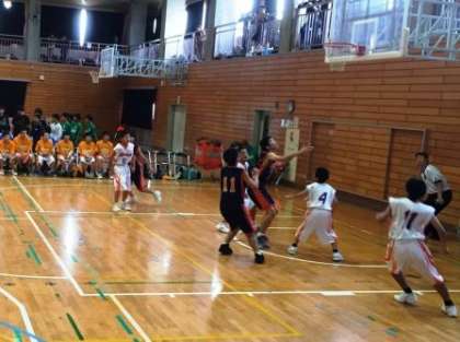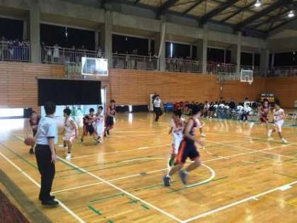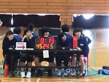 本校にて、中学校新人バスケットボール大会県中地区大会が行われています。写真は、本校男子チームの試合の様子と、女子バスケ部の生徒が、審判を責任を持って行っているところです。がんばれ、一中。