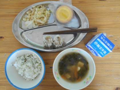 6月20日(月)の給食のメニューは「菜めし、ポークシューマイ、大根のキムチ和え、中華スープ、シークワーサータルト、牛乳」です。