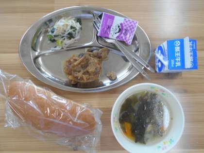 なお、上の写真は<検食用>で量を少なめにしてあります。子どもたちの給食はもっとボリュームがあります。