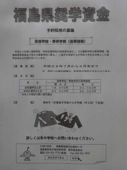 既に文書配布致しましたが、福島県教育委員会より『福島県奨学資金』予約採用の募集がきております。募集期間は7月〜9月末です。