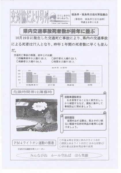 福島県交通対策協議会より『交通死亡事故防止活動の推進について』の依頼がきております。依頼文によりますと、今年の県内での交通死亡事故について、10月19日現在で75件77人と昨年の年間死者数と同数となり、極めて憂慮すべき状況にあります。