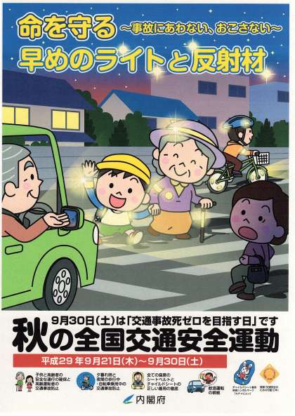 平成29年9月21日(木)から30日(土)までの10日間、下記の要領で『秋の全国交通安全運動』が実施されています。保護者の皆様にも春の全国交通安全運動のご理解とご協力をよろしくお願いいたします。