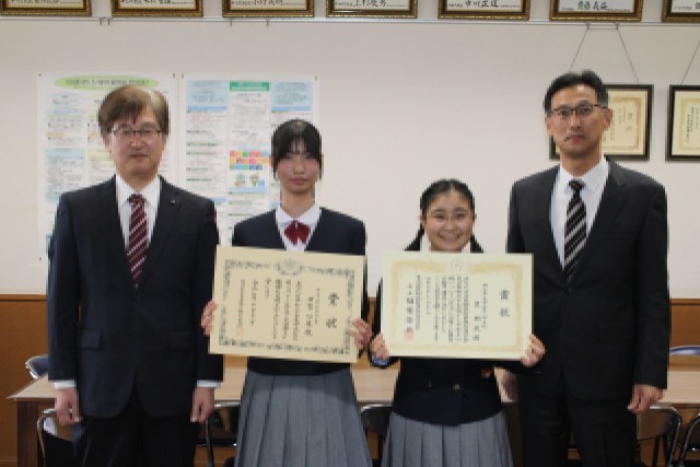 令和7年度「税についての作文」コンクールにおいて、本校生徒2名が見事入賞し、校長室にて税務署長さんから表彰状が手渡されました。1名は、東北地区において優秀賞を受賞し、もう1名は県教育委員会教育長賞を受賞しました。すばらしい賞を受賞することができました。